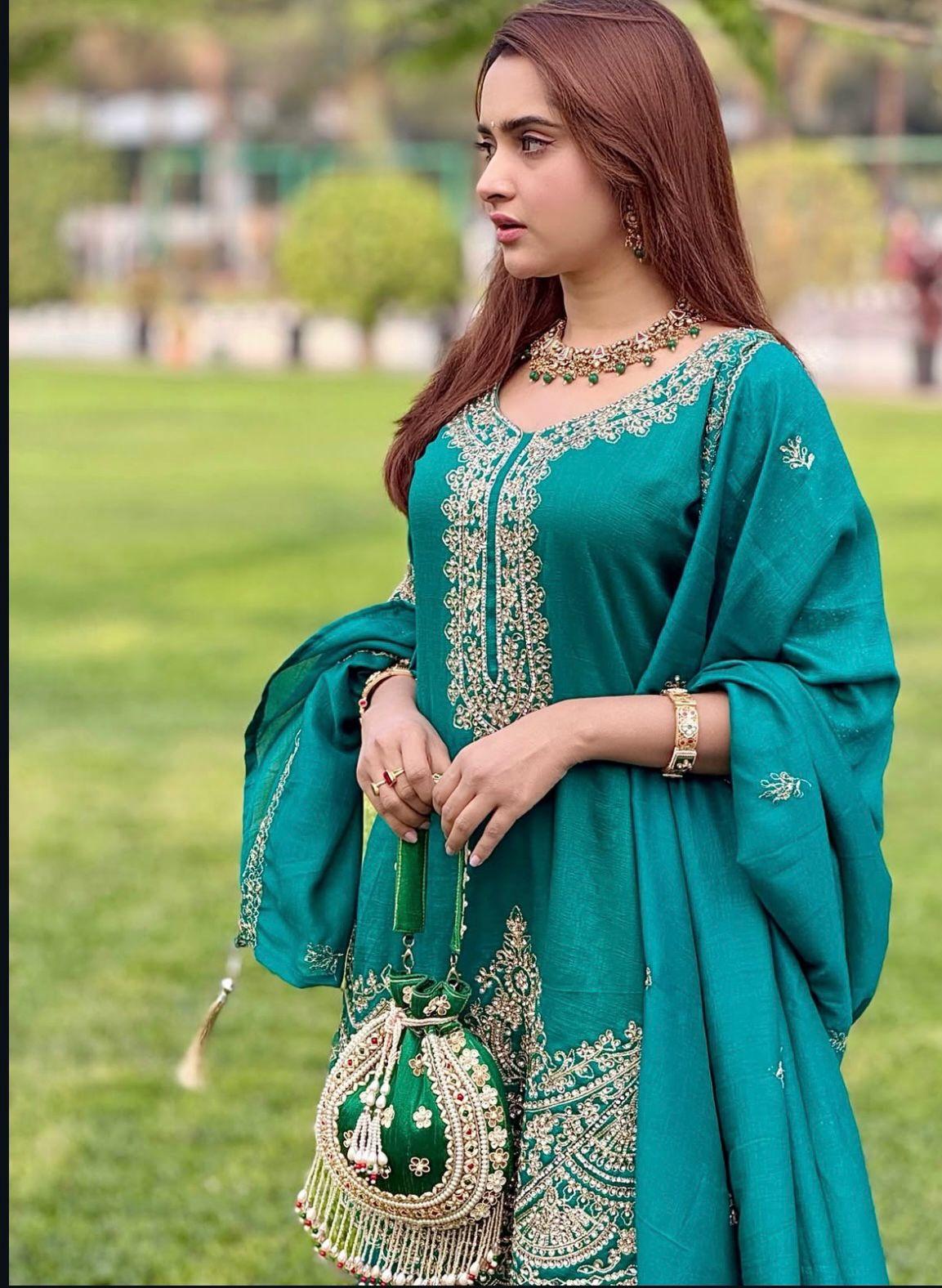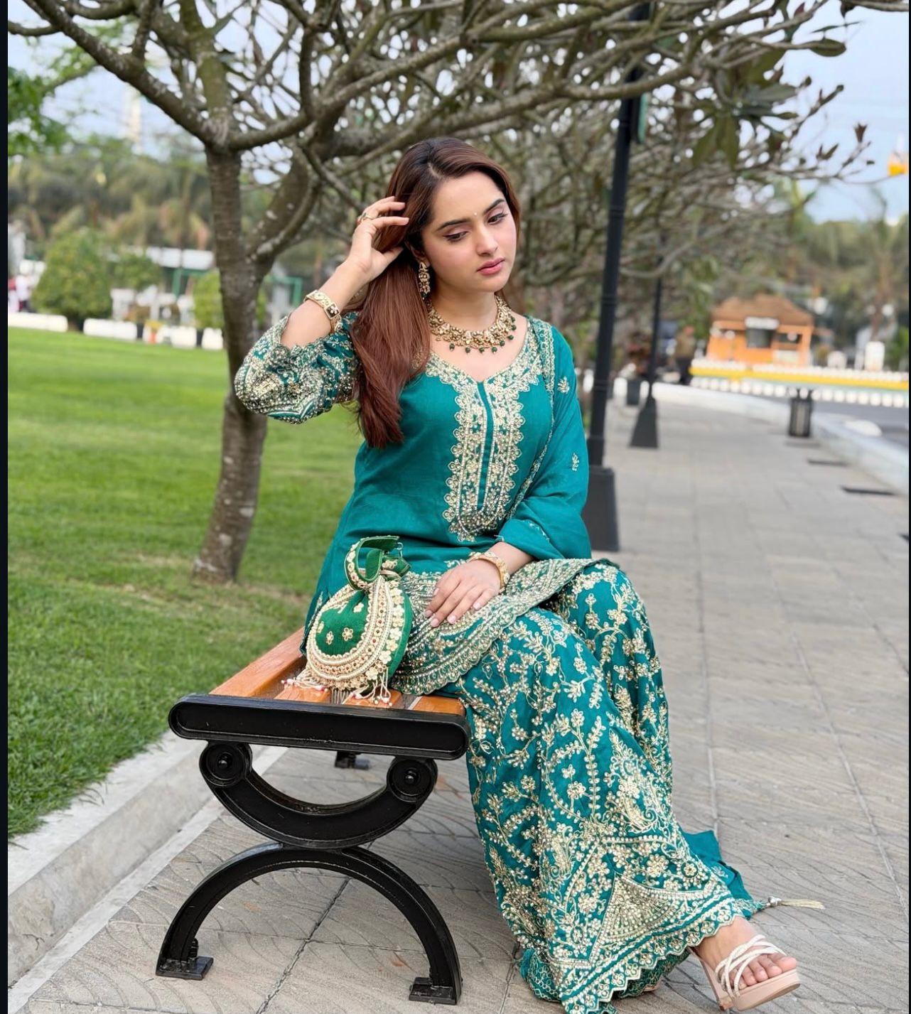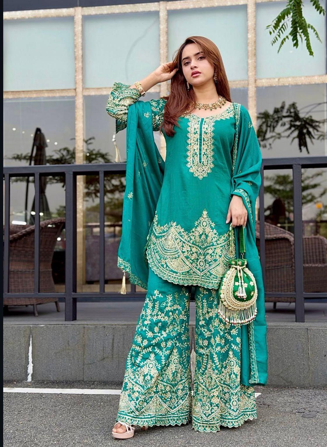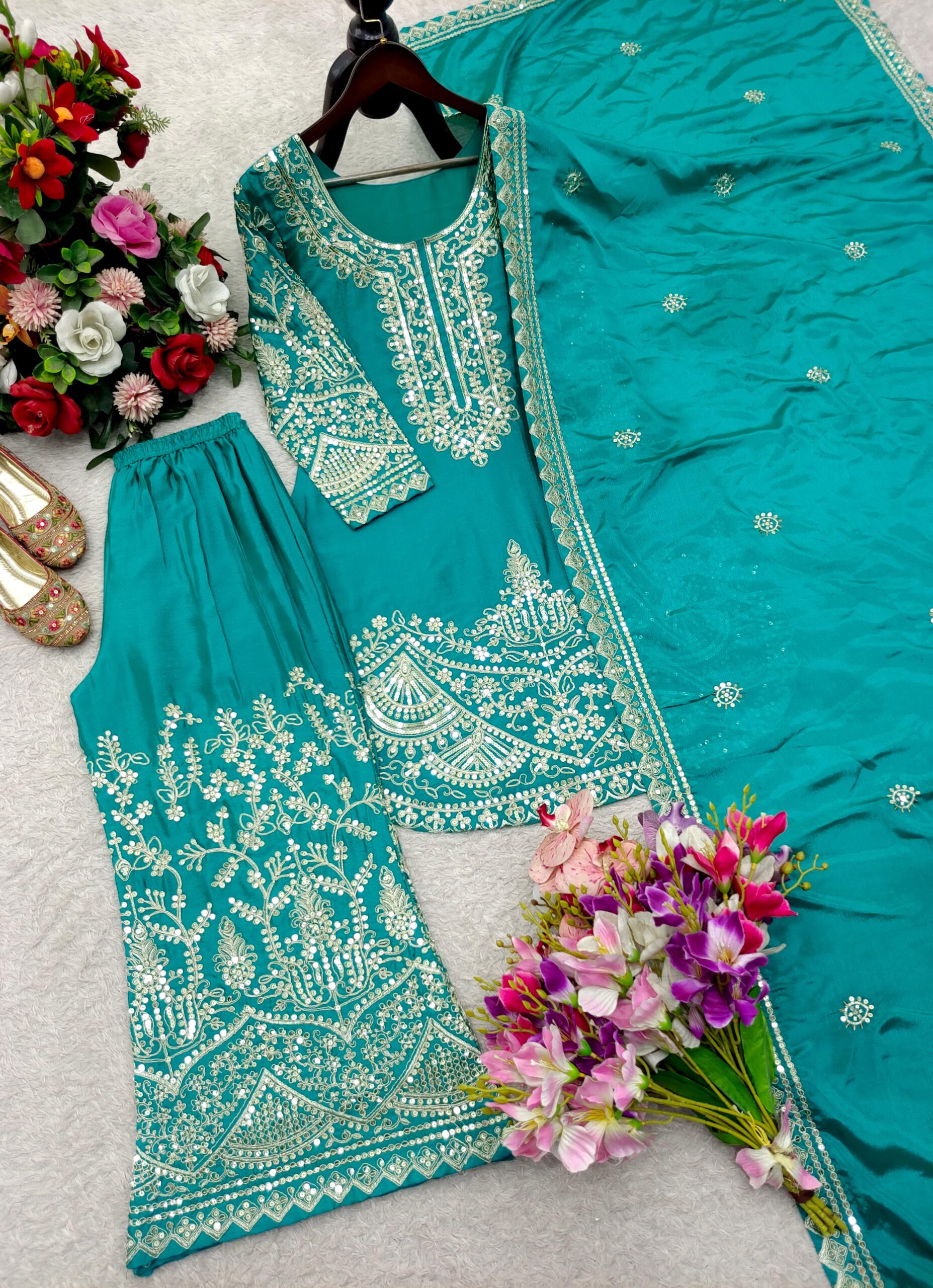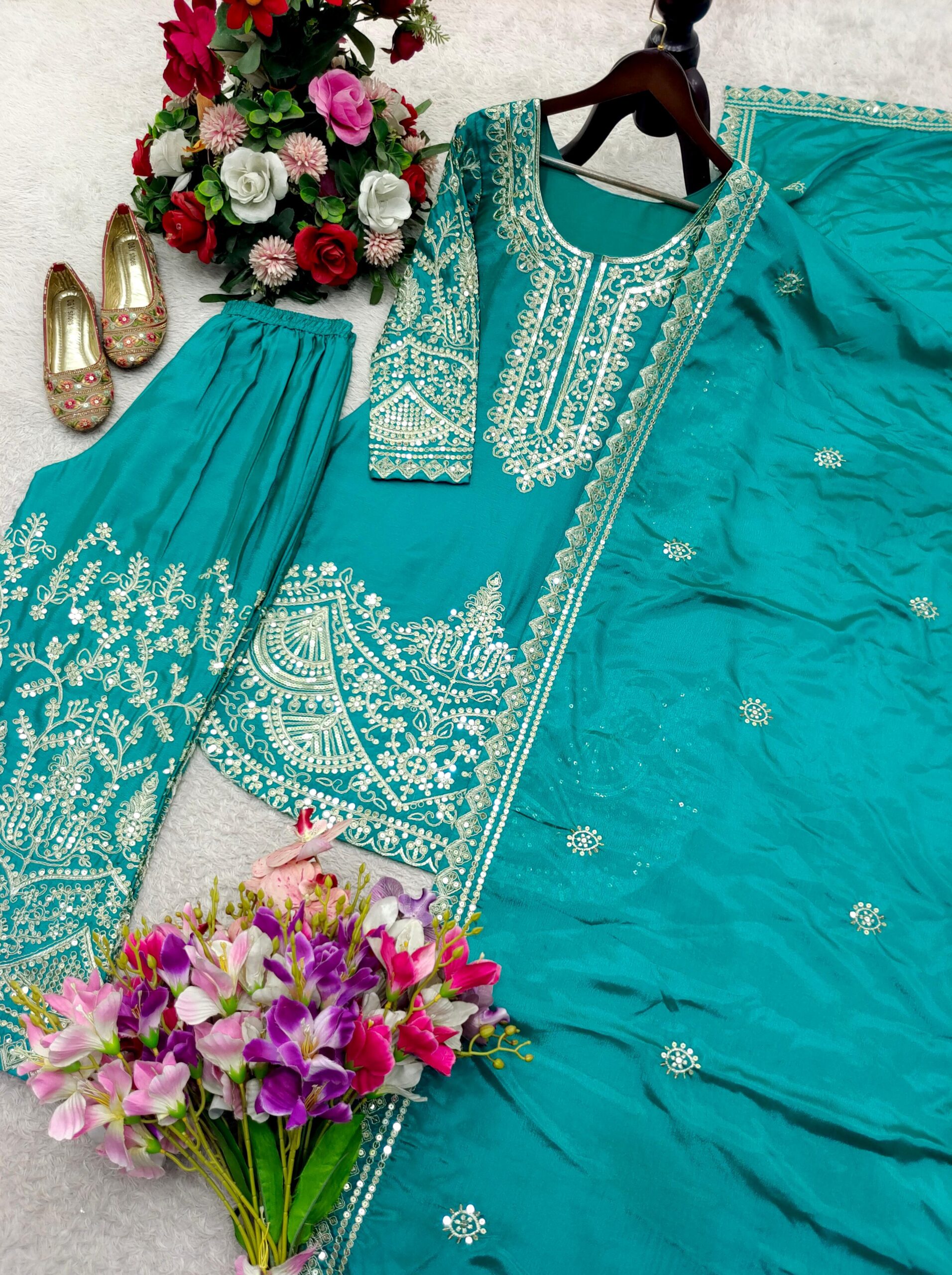 Ready-to-Wear Top, Palazzo & Dupatta Set crafted in rich Pure Chinon Silk. Adorned with elegant Sequence & Coding Dori Embroidery, this outfit is the perfect choice for festive celebrations, parties, and special occasions. Feel confident, stylish, and effortlessly glamorous every time you wear it.