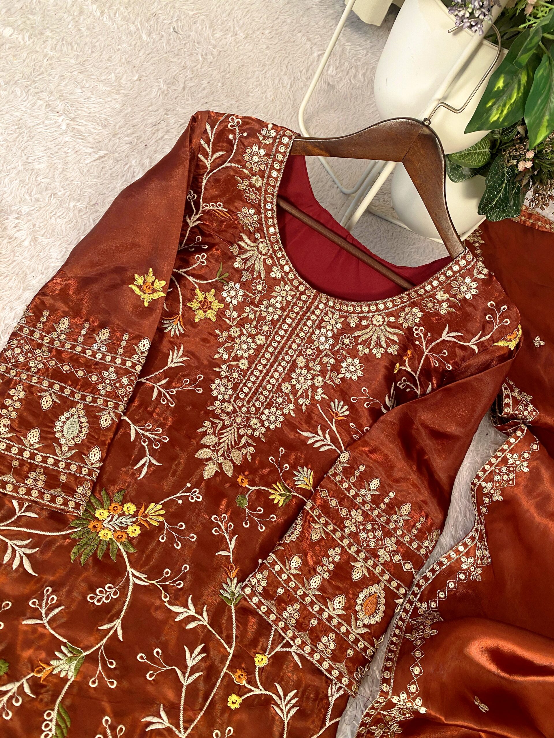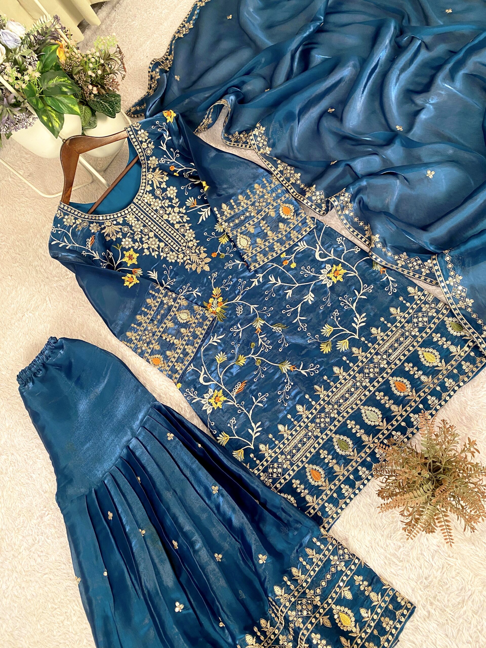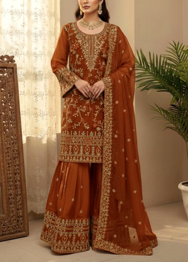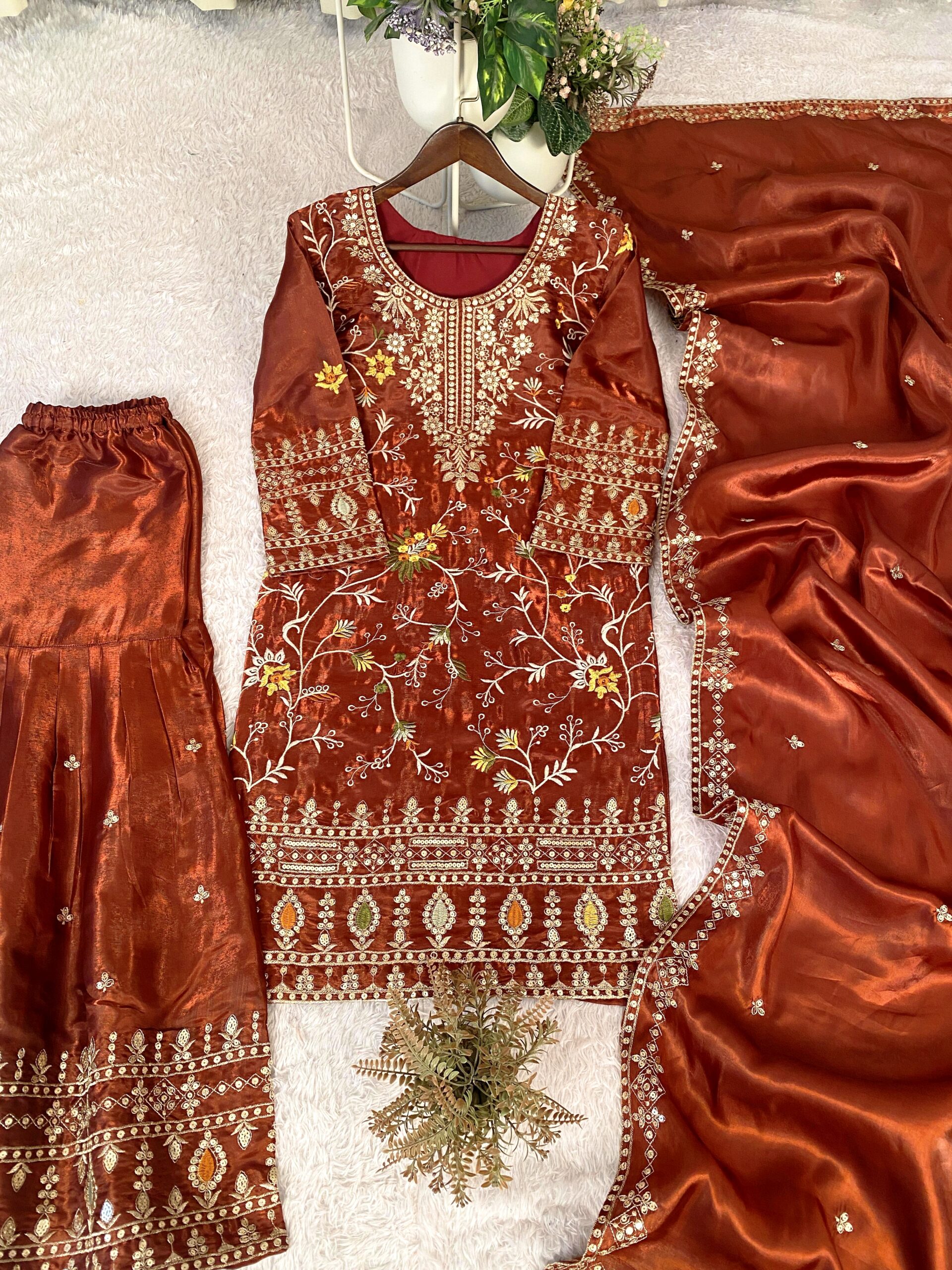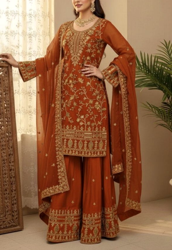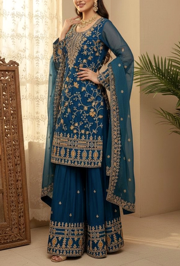 Turn heads this festive and wedding season with our premium sequence embroidery worked Topโ€“Shararaโ€“Dupatta set, crafted in luxurious Jimmy Choo fabric for a rich and graceful look.
