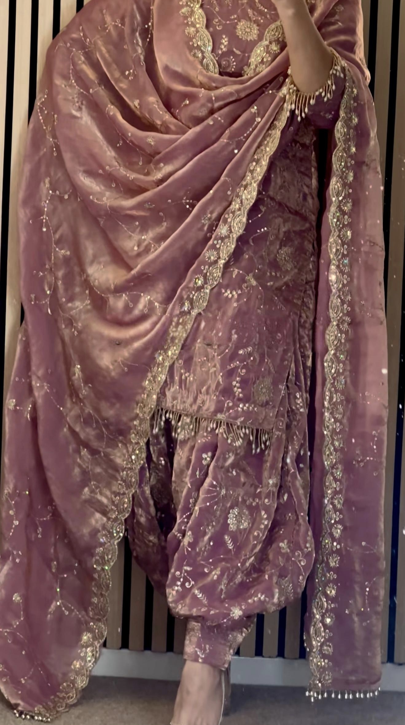 The top is made from Pure Frendy Silk with heavy embroidery and sequence work, paired with a Pure Frendy Silk Patiyala Salwar featuring matching embroidery.