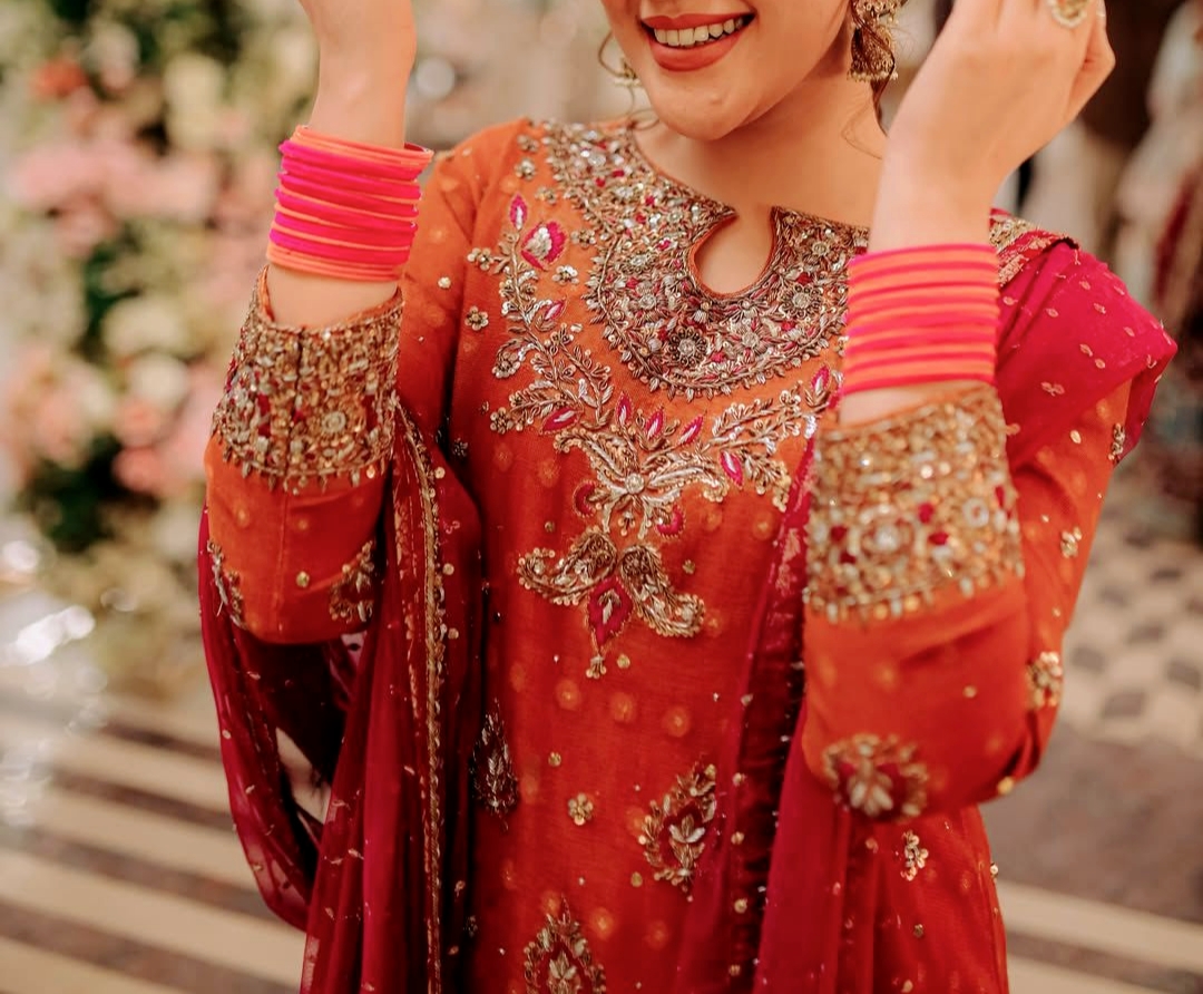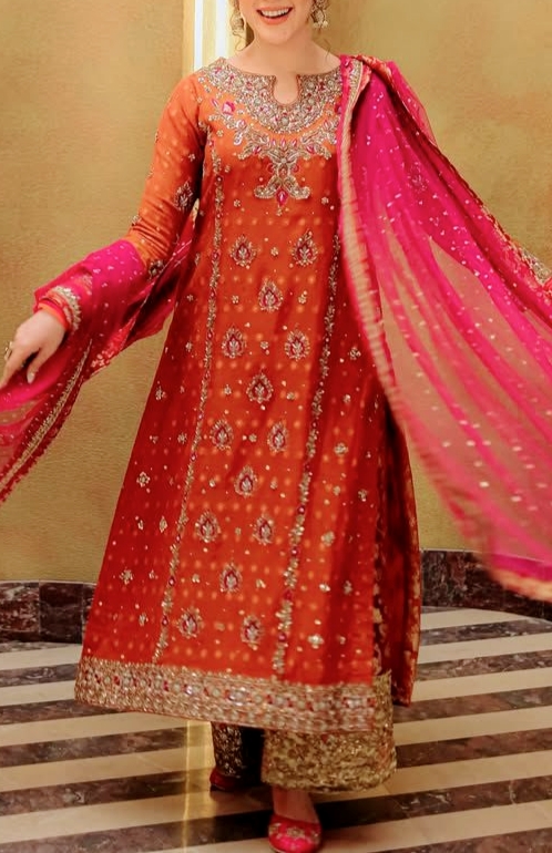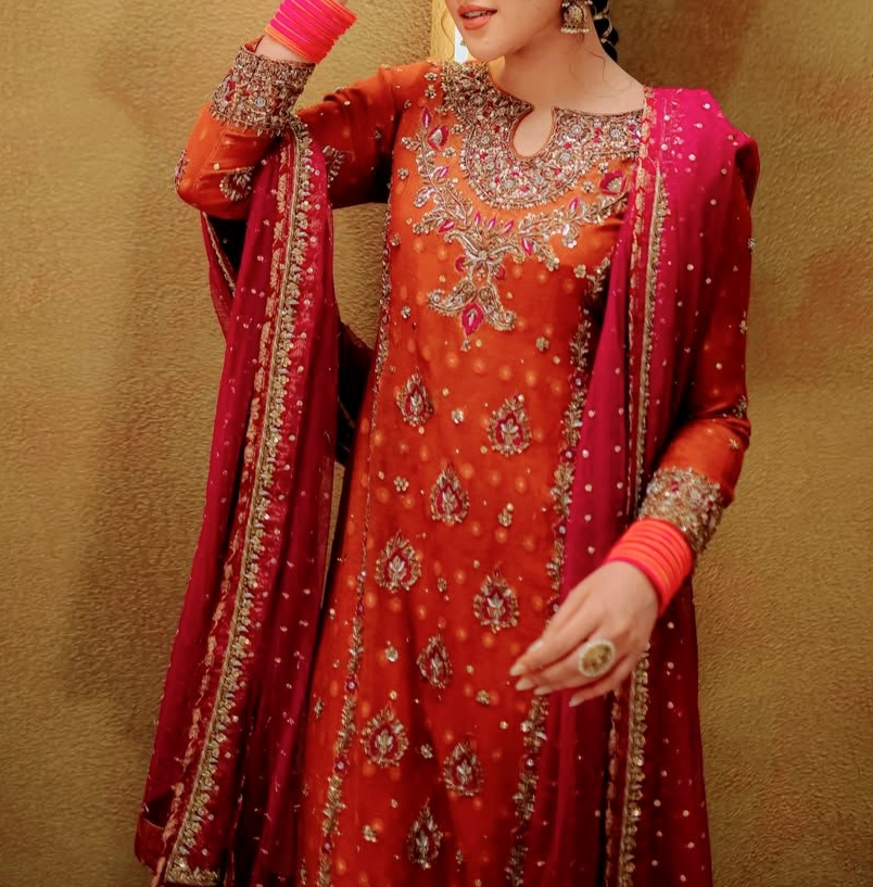 Work: Rich 5mm sequins, zari & thread embroidery with exquisite pearl work.