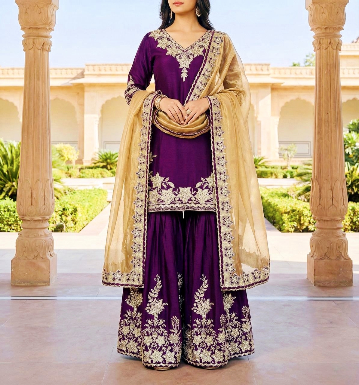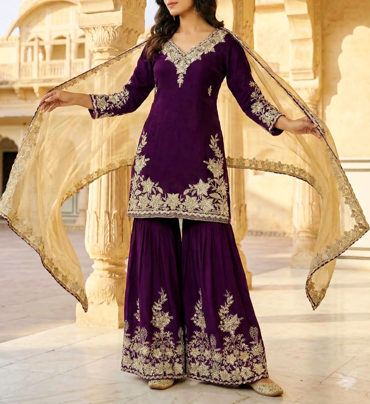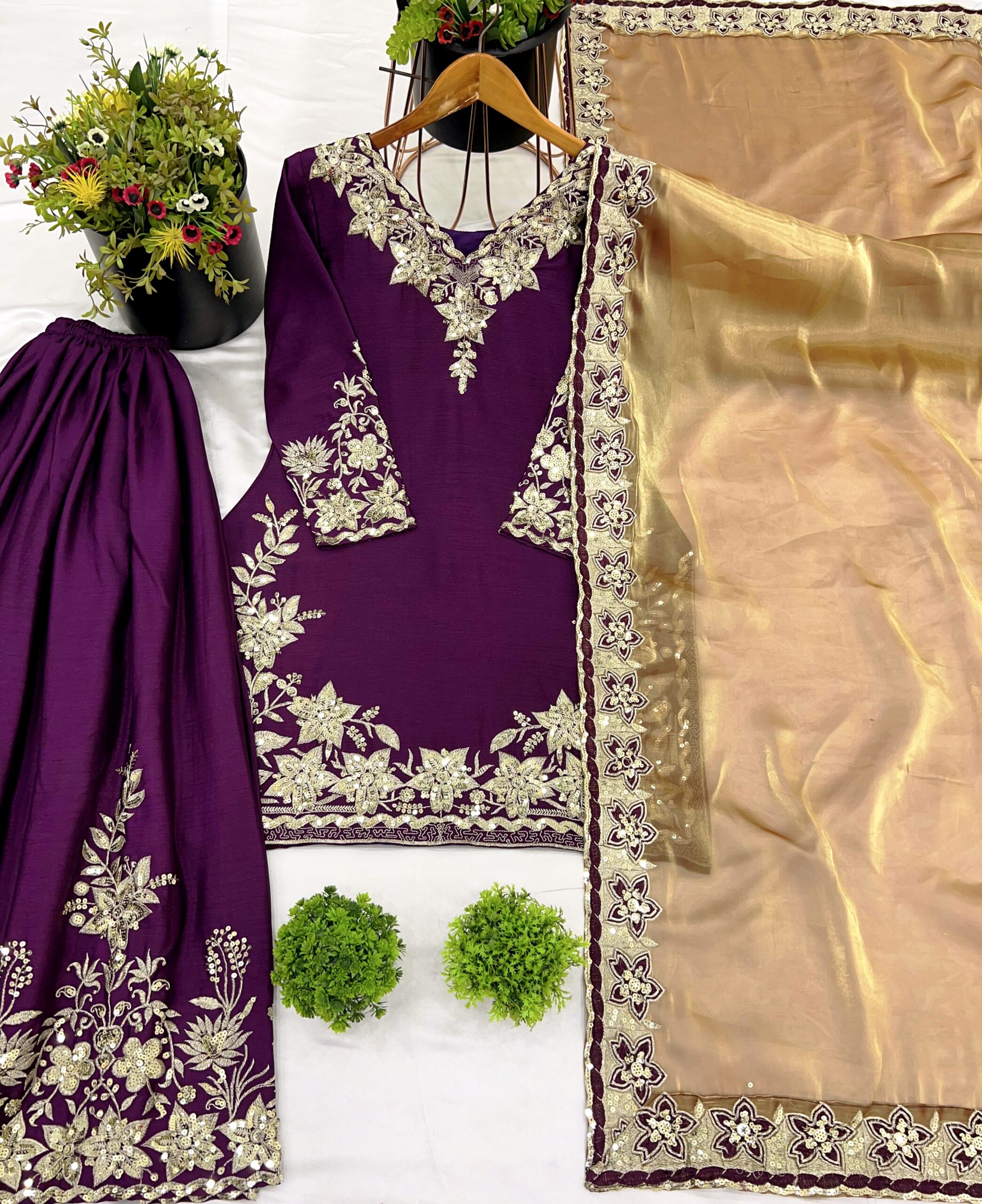 Pure Chinon Silk Top-Palazzo-Dupatta with Heavy embroidery & sequence work.