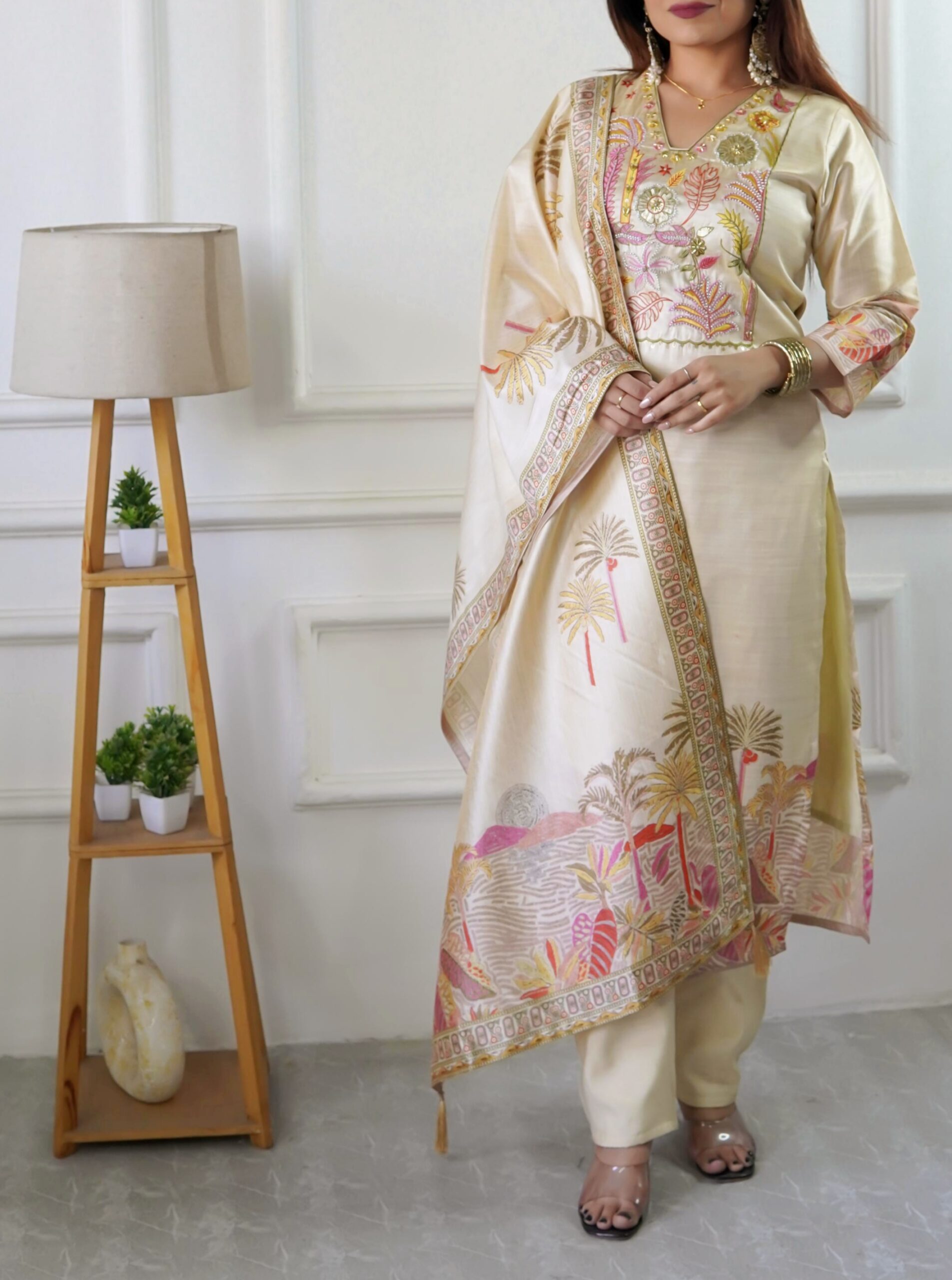 Elevate your festive and partywear style with this Traditional Assam Silk Suit Set. Adorned with elegant sequence embroidery & moti work, this fully stitched outfit blends comfort with timeless glamour.