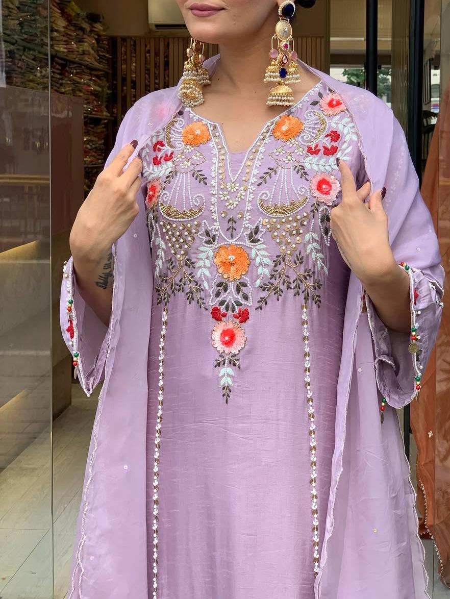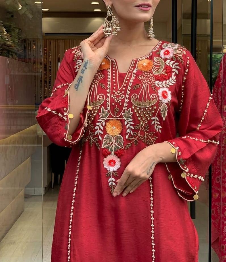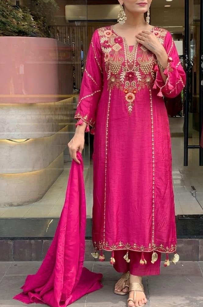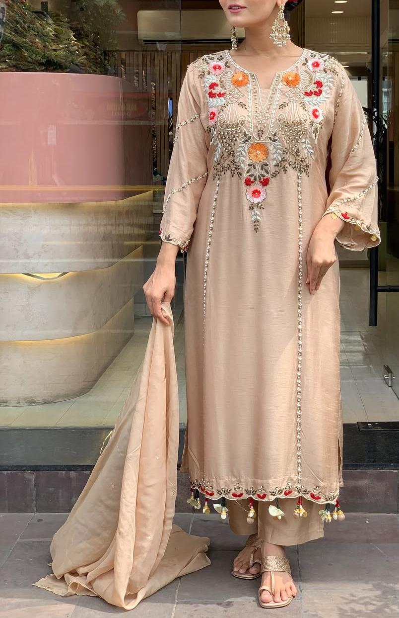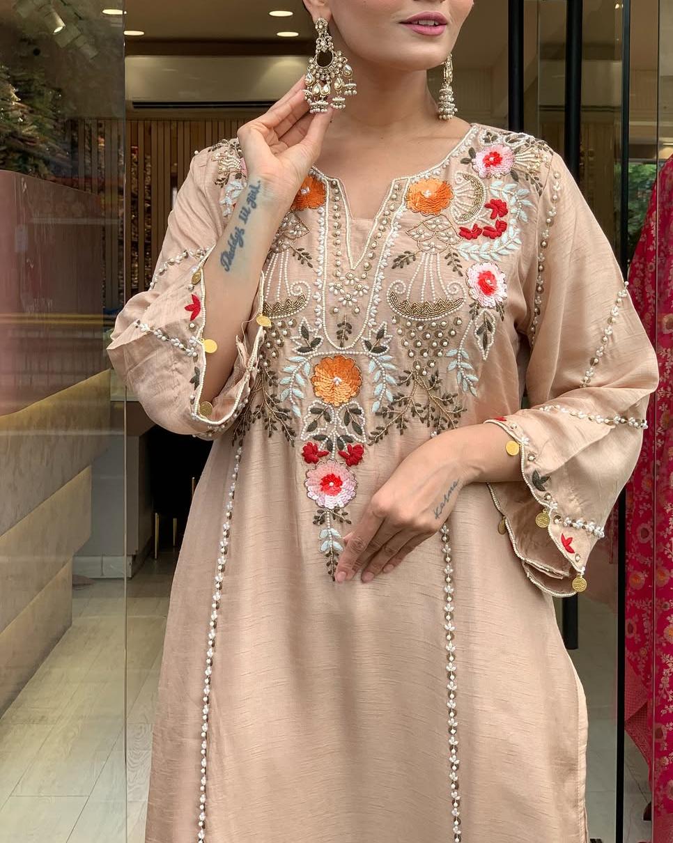 Step into timeless beauty with this stunning Pure Viscose Chanderi Silk Kurta Set, beautifully adorned with intricate sequence coding embroidery work that adds the perfect festive sparkle.