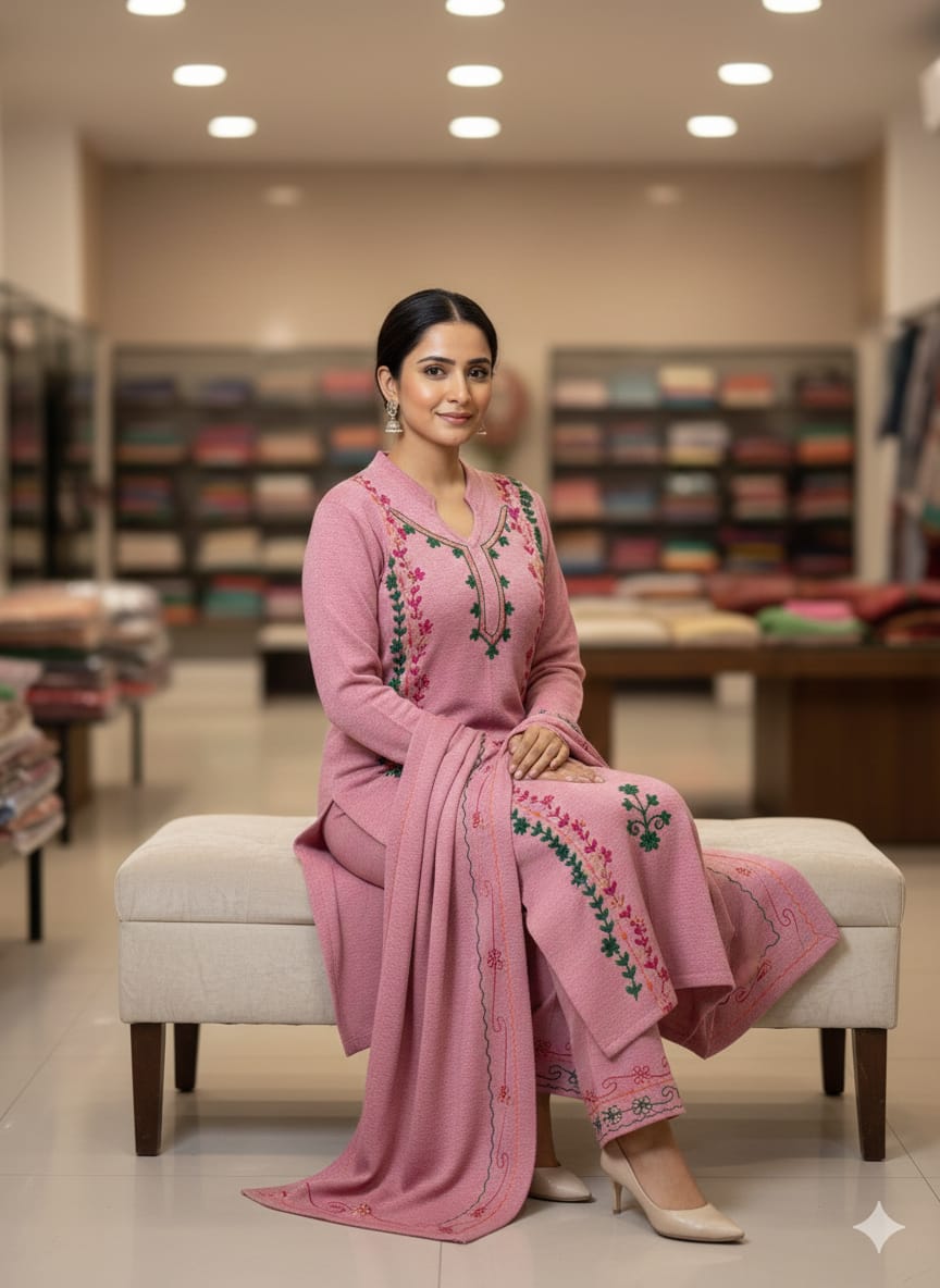 Elevate your ethnic wardrobe with this premium woolen suit featuring exquisite handcrafted embroidery that beautifully enhances its traditional charm.