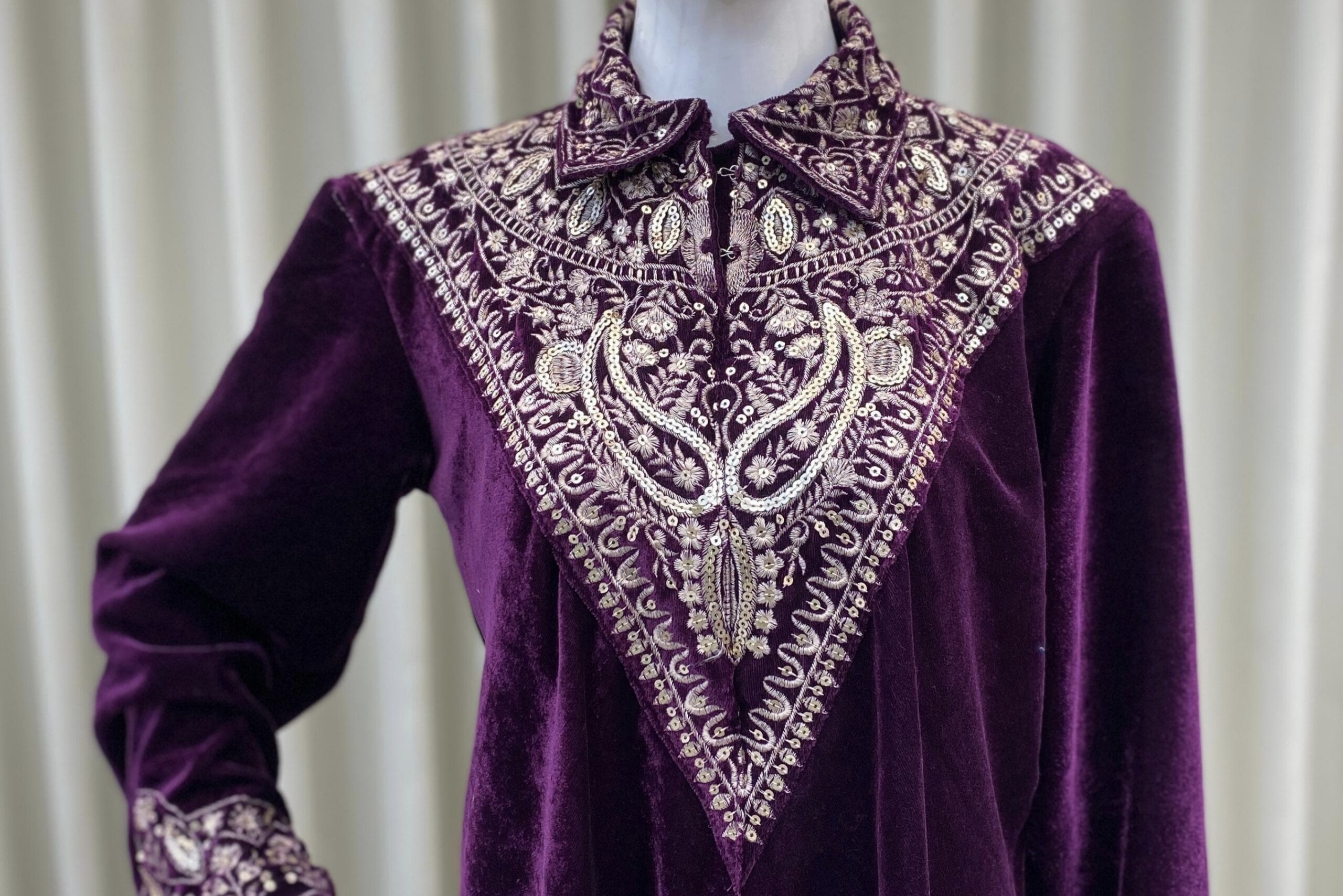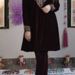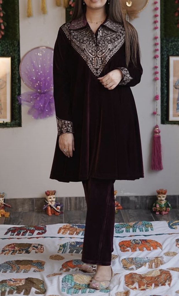 Elevate your winter wardrobe with this bold Black Velvet Kurta Palazzo Set. Adorned with shimmering sequin embroidery on the front and back, the outfit pairs comfort with luxury through its micro-cotton inner lining.