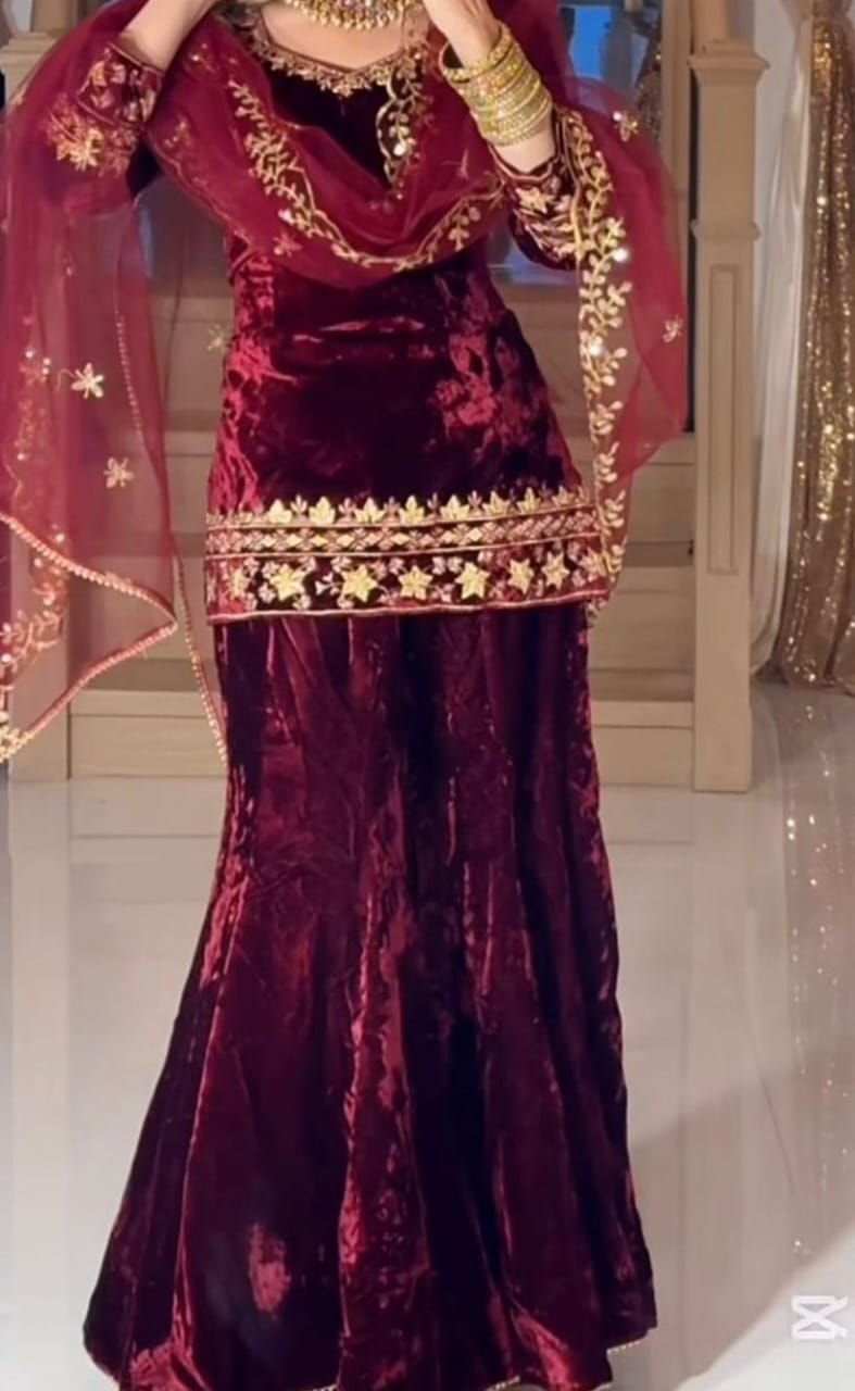 Pure heavy viscose velvet with rich multi-needle embroidered sequence work. (Full Sleeves)