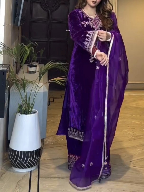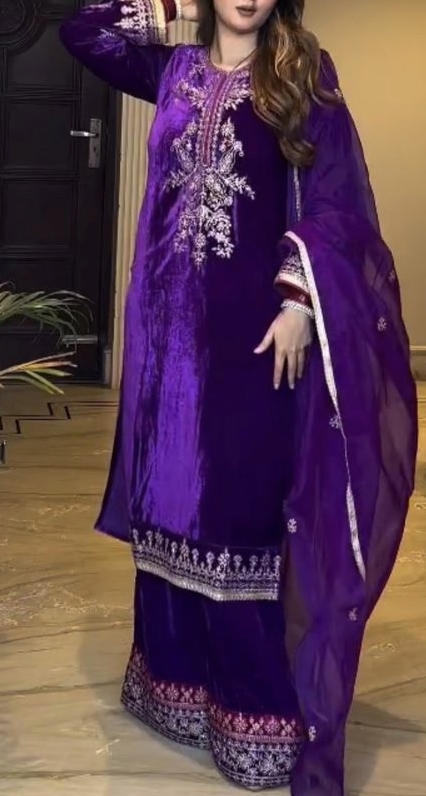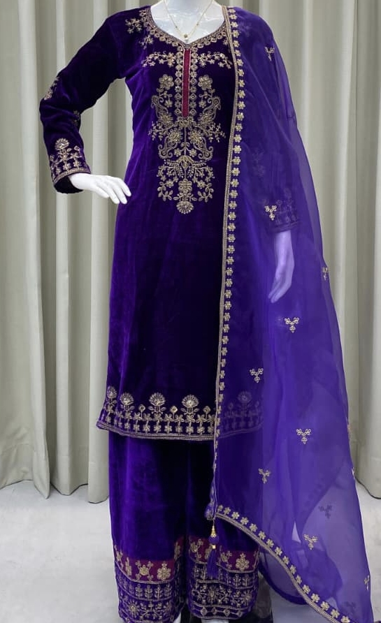 Wrap yourself in cozy comfort with this luxurious Velvet Kurta–Palazzo set, designed to elevate your winter wardrobe. Featuring exquisite sequence embroidery and paired with a graceful Organza dupatta, this ensemble blends warmth, style, and sophistication effortlessly.