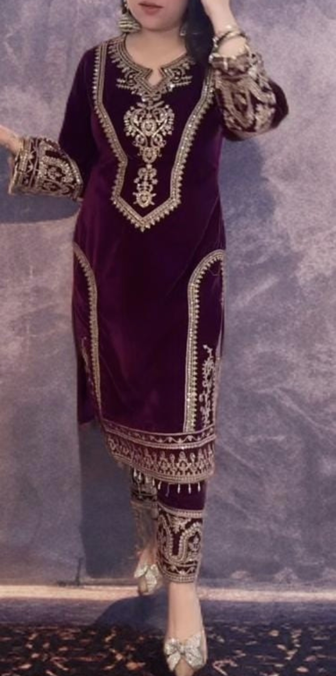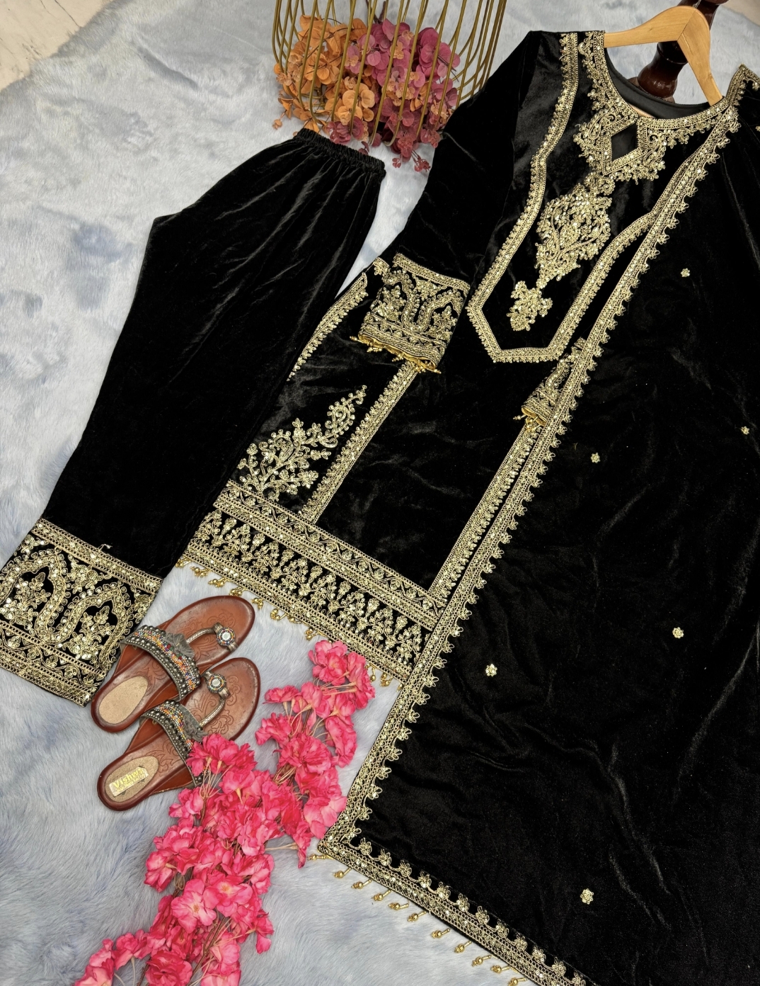 Top: Heavy Pure Viscose Velvet with intricate 3mm Sequin & Coding Dori Embroidery, adorned with Fancy Moti Latkan and full sleeves.